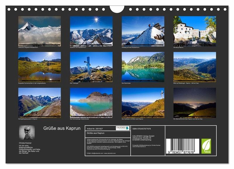 QUALITÄT - Hochwertiger Fotokalender mit 12 wunderschönen Motiven auf lichtbeständigem Bilderdruckpapier, robuste Spiralbindung mit Aufhängebügel.NACHHALTIG - deutliche Abfallreduzierung durch bedarfsgerechte Einzelstückfertigung, umweltfreundliches FSC-zertifiziertes Papier, Produktion in Deutschland, klimabewusste Logistik.PERFEKTES GESCHENK - Kalender für Freunde und Familie, für Kinder und Erwachsene, jung und alt, zu Weihnachten, Geburtstag oder zwischendurch.VIELFALT - Bildkalender in verschiedenen Formaten, z.B. DIN A5, DIN A4, DIN A3 sowie DIN A2. Ob Naturmotiv, Gemälde oder Fotos, ideal für ein persönliches Wohlfühlambiente.Schöne Impressionen von Kaprun und Kitzsteinhorn von Autor(in): Christa Kramer