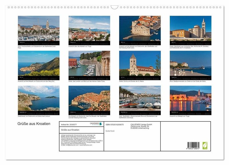 QUALITÄT - Hochwertiger Fotokalender mit 12 wunderschönen Motiven auf lichtbeständigem Bilderdruckpapier, robuste Spiralbindung mit Aufhängebügel.NACHHALTIG - deutliche Abfallreduzierung durch bedarfsgerechte Einzelstückfertigung, umweltfreundliches FSC-zertifiziertes Papier, Produktion in Deutschland, klimabewusste Logistik.PERFEKTES GESCHENK - Kalender für Freunde und Familie, für Kinder und Erwachsene, jung und alt, zu Weihnachten, Geburtstag oder zwischendurch.VIELFALT - Bildkalender in verschiedenen Formaten, z.B. DIN A5, DIN A4, DIN A3 sowie DIN A2. Ob Naturmotiv, Gemälde oder Fotos, ideal für ein persönliches Wohlfühlambiente.Grüße aus Kroatien, 12 Ideen für den Urlaub! Entdecken Sie einen kleinen Teil architektonischer Schönheiten Kroatiens in diesem Kalender. von Autor(in): Gunter Kirsch