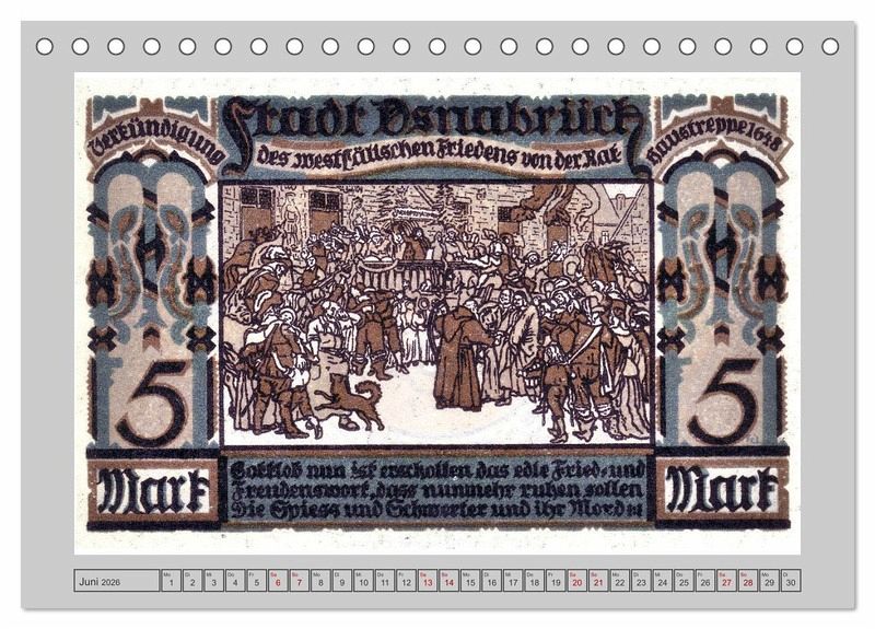 Das bedeutendste Ereignis in der Geschichte von Osnabrück lässt sich auf den Tag genau datieren. Am 25. Oktober 1648 wurde von der Treppe des Osnabrücker Rathauses der Westfälische Friede verkündet. Heute begreift sich Osnabrück als "Die Friedensstadt". Der Westfälische Friede ist auch das Motiv eines Notgeldscheins aus dem Jahre 1921.