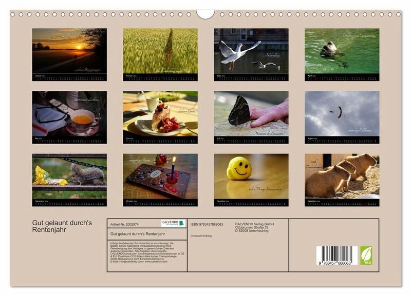 QUALITÄT - Hochwertiger Fotokalender mit 12 wunderschönen Motiven auf lichtbeständigem Bilderdruckpapier, robuste Spiralbindung mit Aufhängebügel.NACHHALTIG - deutliche Abfallreduzierung durch bedarfsgerechte Einzelstückfertigung, umweltfreundliches FSC-zertifiziertes Papier, Produktion in Deutschland, klimabewusste Logistik.PERFEKTES GESCHENK - Kalender für Freunde und Familie, für Kinder und Erwachsene, jung und alt, zu Weihnachten, Geburtstag oder zwischendurch.VIELFALT - Bildkalender in verschiedenen Formaten, z.B. DIN A5, DIN A4, DIN A3 sowie DIN A2. Ob Naturmotiv, Gemälde oder Fotos, ideal für ein persönliches Wohlfühlambiente.Mit lustigen Motiven durch den Ruhestand von Autor(in): Christoph Kolberg
