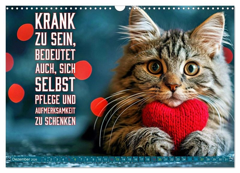 "Gute Besserung - mit coolen Sprüchen" ist eine Sammlung von aufmunternden Genesungswünschen, die Menschen in schwierigen Zeiten ein Lächeln ins Gesicht zaubern sollen. Ob nach einer Krankheit, Operation oder einfach nur bei einer Erkältung - diese Sprüche sind darauf ausgelegt, Trost zu spenden und Mut zu machen. Sie kombinieren positive Botschaften mit einem Hauch von Nachdenklichkeit, um den Heilungsprozess leichter und angenehmer zu gestalten. Dieser Kalender wurde mit Unterstützung der KI erstellt.