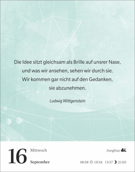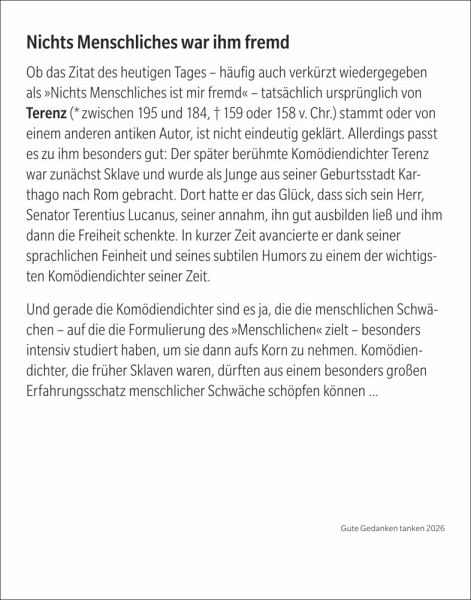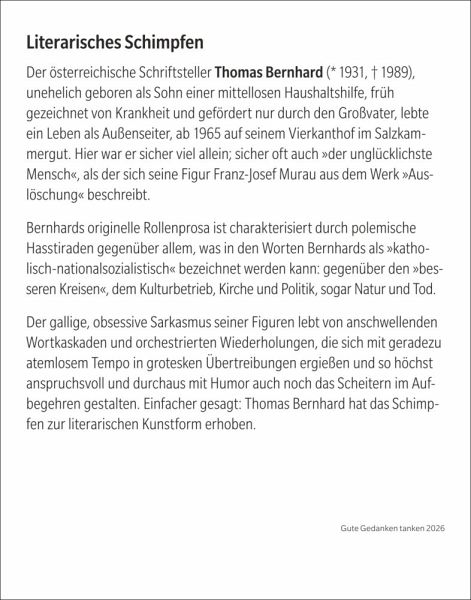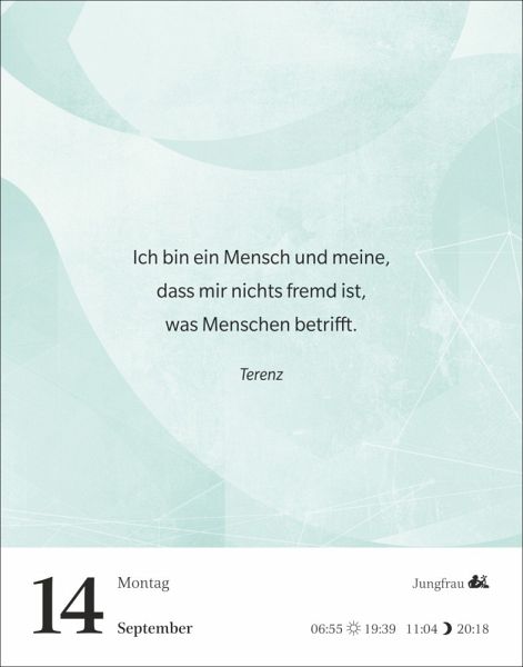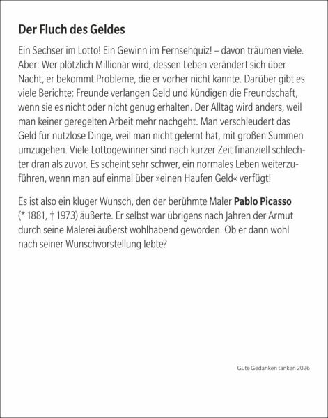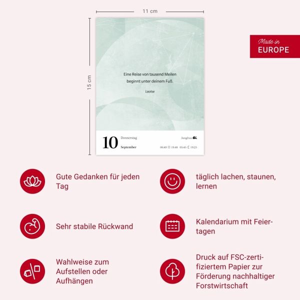 - Inspirierende Zitate für jede Lebenslage: Der neue Tagesabreißkalender "Gute Gedanken tanken"- Mit klugen Lebensweisheiten aus Literatur, Lebenskunst, Spiritualität und Philosophie, von Hildegard von Bingen bis Loriot- Wohltuende Lektüre: Tageskalender mit Denkanstößen, die auf jeder Rückseite vertieft werden- Gute Gedanken für jeden Tag, ob im Büro oder auf dem Nachtisch: Praktischer Kalender zum Aufstellen oder Aufhängen im Format 11 x 14 cm- Eine tägliche Quelle der Inspiration: Die Abreißkalender von Harenberg aus dem Athesia Kalenderverlag