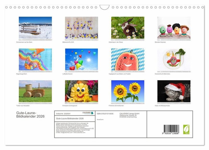 QUALITÄT - Hochwertiger Fotokalender mit 12 wunderschönen Motiven auf lichtbeständigem Bilderdruckpapier, robuste Spiralbindung mit Aufhängebügel.NACHHALTIG - deutliche Abfallreduzierung durch bedarfsgerechte Einzelstückfertigung, umweltfreundliches FSC-zertifiziertes Papier, Produktion in Deutschland, klimabewusste Logistik.PERFEKTES GESCHENK - Kalender für Freunde und Familie, für Kinder und Erwachsene, jung und alt, zu Weihnachten, Geburtstag oder zwischendurch.VIELFALT - Bildkalender in verschiedenen Formaten, z.B. DIN A5, DIN A4, DIN A3 sowie DIN A2. Ob Naturmotiv, Gemälde oder Fotos, ideal für ein persönliches Wohlfühlambiente.Motive mit "Fühl-Dich-fröhlich"-Effektvon Autor(in): SusaZoom