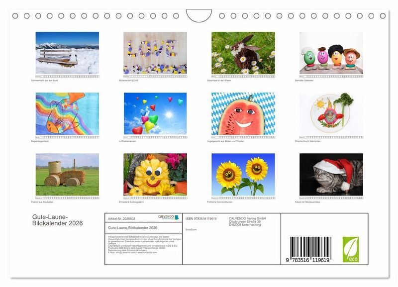QUALITÄT - Hochwertiger Fotokalender mit 12 wunderschönen Motiven auf lichtbeständigem Bilderdruckpapier, robuste Spiralbindung mit Aufhängebügel.NACHHALTIG - deutliche Abfallreduzierung durch bedarfsgerechte Einzelstückfertigung, umweltfreundliches FSC-zertifiziertes Papier, Produktion in Deutschland, klimabewusste Logistik.PERFEKTES GESCHENK - Kalender für Freunde und Familie, für Kinder und Erwachsene, jung und alt, zu Weihnachten, Geburtstag oder zwischendurch.VIELFALT - Bildkalender in verschiedenen Formaten, z.B. DIN A5, DIN A4, DIN A3 sowie DIN A2. Ob Naturmotiv, Gemälde oder Fotos, ideal für ein persönliches Wohlfühlambiente.Motive mit "Fühl-Dich-fröhlich"-Effektvon Autor(in): SusaZoom