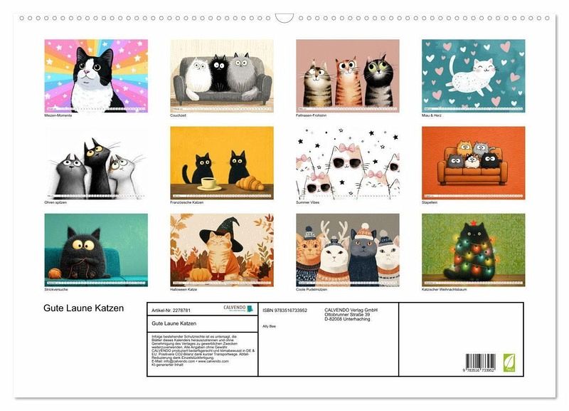 Entdecken Sie den ultimativen Katzenkalender für das kommende Jahr! Unser Kalender mit lustigen Katzenillustrationen bringt jeden Monat ein Lächeln auf Ihr Gesicht. Perfekt für Katzenliebhaber, die ihre Leidenschaft für die Samtpfoten mit Humor verbinden möchten. Jede Seite bietet einzigartige, handgezeichnete Motive, die nicht nur Ihren Alltag erheitern, sondern auch als stilvolle Dekoration für Ihr Zuhause oder Büro dienen. Ideal als Geschenk für Freunde, Familie oder einfach als kleines Vergnügen für sich selbst. Verpassen Sie nicht die Gelegenheit, sich jeden Tag von den charmanten Illustrationen inspirieren zu lassen!