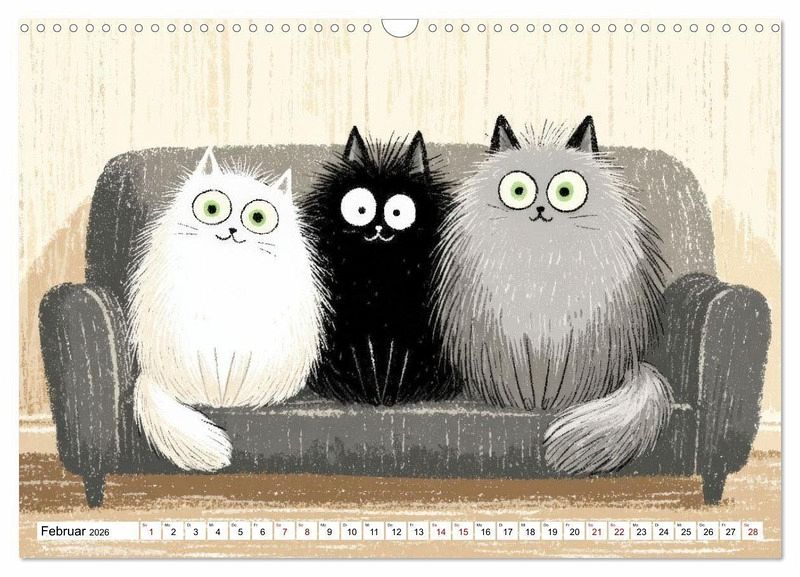 Entdecken Sie den ultimativen Katzenkalender für das kommende Jahr! Unser Kalender mit lustigen Katzenillustrationen bringt jeden Monat ein Lächeln auf Ihr Gesicht. Perfekt für Katzenliebhaber, die ihre Leidenschaft für die Samtpfoten mit Humor verbinden möchten. Jede Seite bietet einzigartige, handgezeichnete Motive, die nicht nur Ihren Alltag erheitern, sondern auch als stilvolle Dekoration für Ihr Zuhause oder Büro dienen. Ideal als Geschenk für Freunde, Familie oder einfach als kleines Vergnügen für sich selbst. Verpassen Sie nicht die Gelegenheit, sich jeden Tag von den charmanten Illustrationen inspirieren zu lassen!
