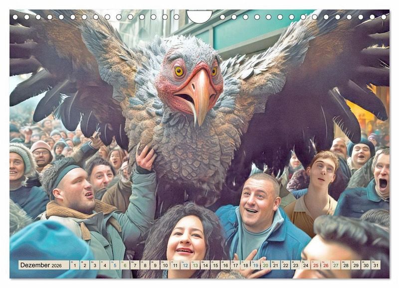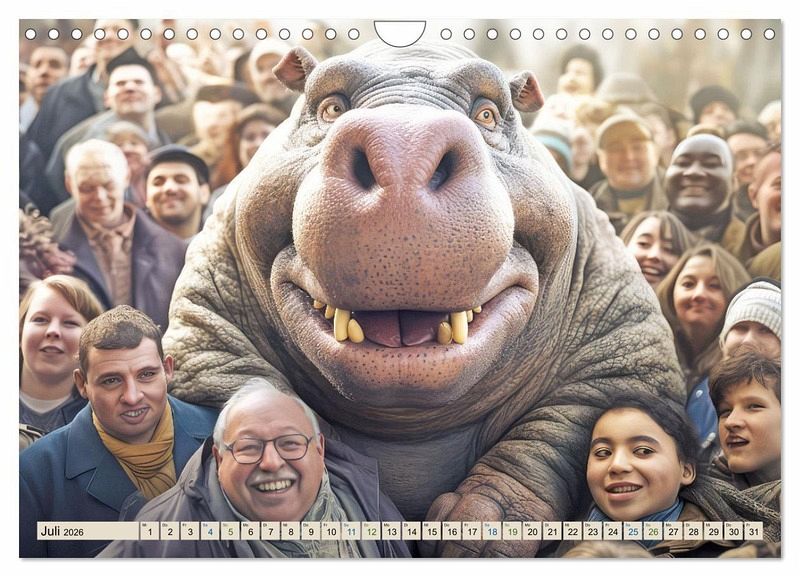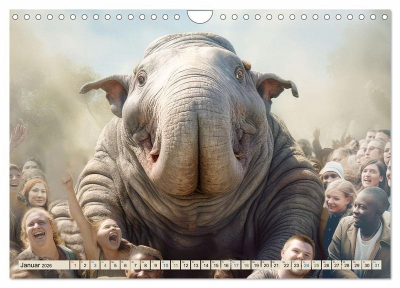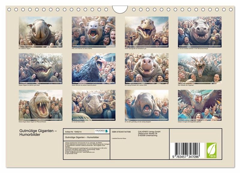Lassen Sie sich von den gutmütigen Giganten verzaubern. Dieser Kalender mit dem Titel Gutmütige Giganten - Humorbilder zeigt fantasievolle Tierwesen, die inmitten jubelnder Menschenmassen für ausgelassene Stimmung sorgen. Dank KI-Technologie entstanden diese einzigartigen Szenen, die garantiert für gute Laune sorgen. Ein Thema, das Erwachsene und Kinder sicher begeistern wird.