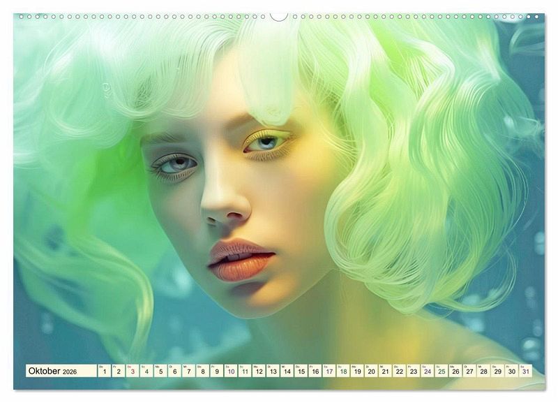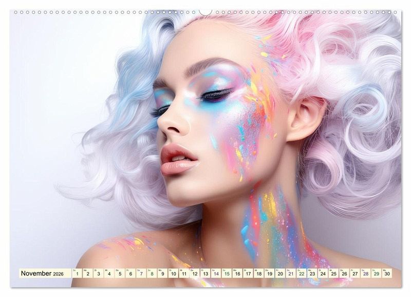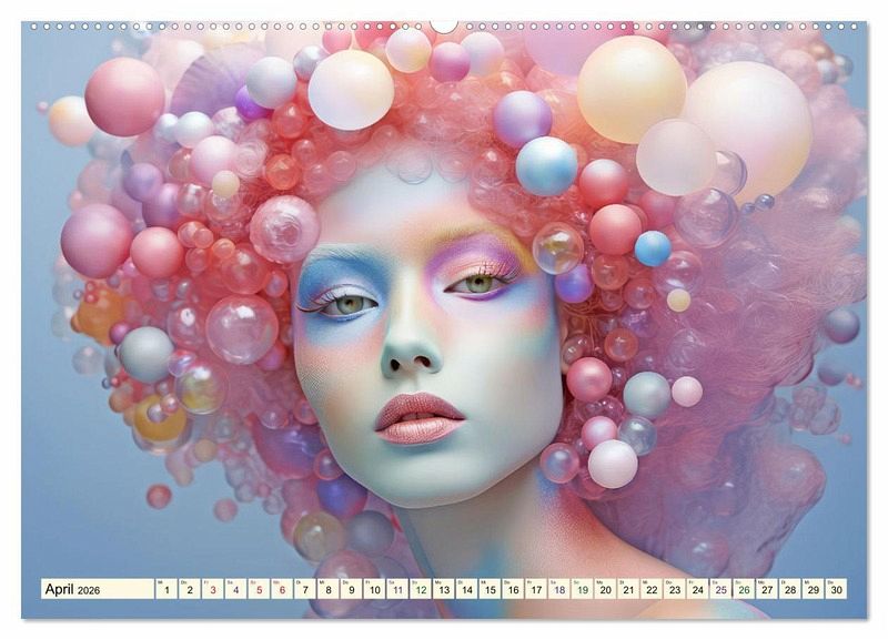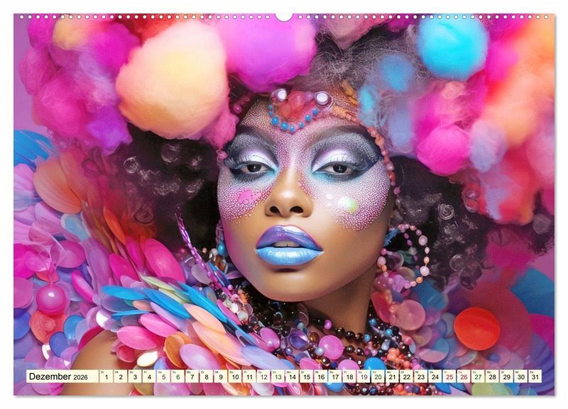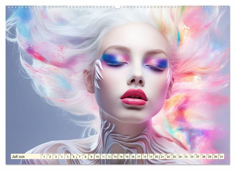 Der Kalender ist eine Hommage an buntes Haar ergänzt mit allerlei Zusätzen, manchmal dem Karneval von Rio ähnlich, oder einfach farbenfroh, elegant oder zart. Jedes KI-Bild erzählt eine Geschichte und fängt die Schönheit der Haare in einer atemberaubenden Dynamik ein. Die kunstvollen Frisuren sind wahre Meisterwerke.