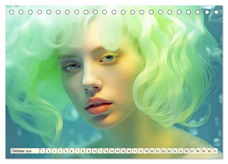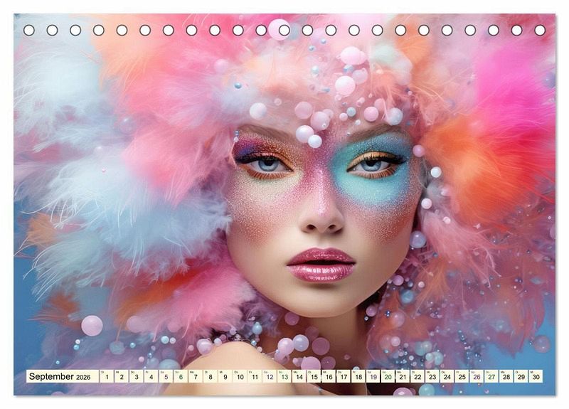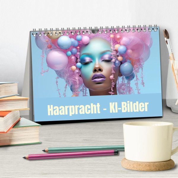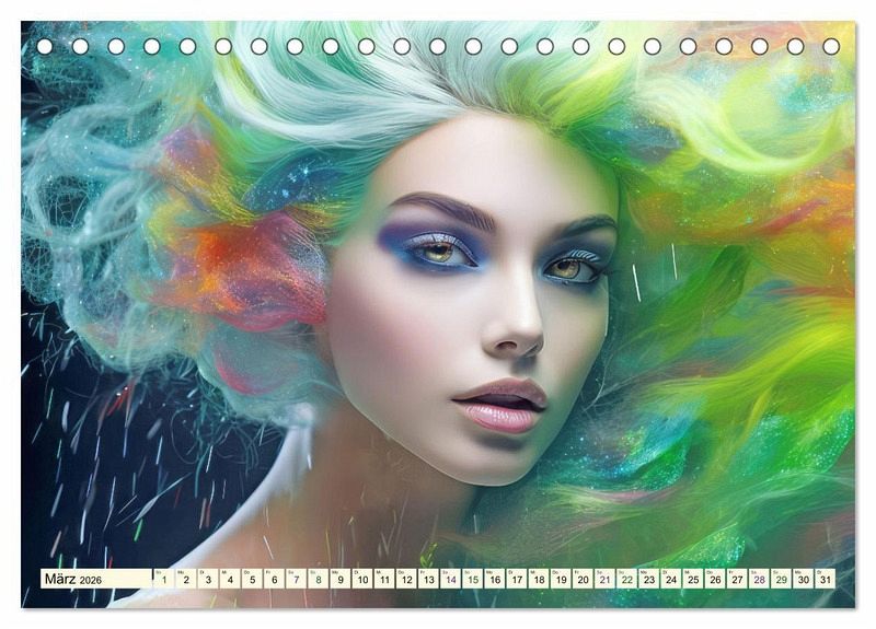 Der Kalender ist eine Hommage an buntes Haar ergänzt mit allerlei Zusätzen, manchmal dem Karneval von Rio ähnlich, oder einfach farbenfroh, elegant oder zart. Jedes KI-Bild erzählt eine Geschichte und fängt die Schönheit der Haare in einer atemberaubenden Dynamik ein. Die kunstvollen Frisuren sind wahre Meisterwerke.