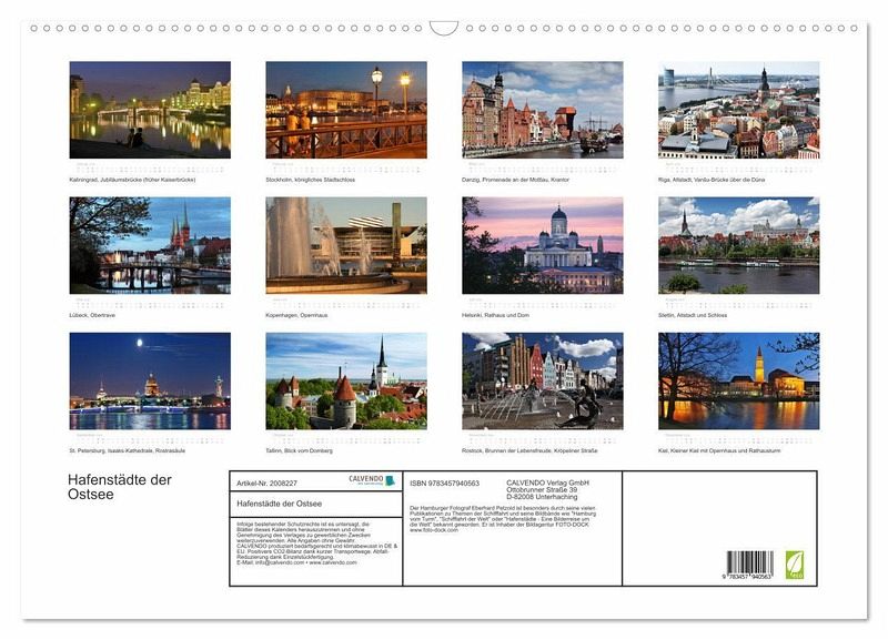 Mit diesem Kalender begibt man sich auf eine Reise über die Ostsee und kann zwölf verschiedene Hafenstädte der Ostsee eindrucksvoll erleben. Jeden Monat befindet man sich in einer anderen Stadt: St. Petersburg, Kaliningrad, Stockholm, Danzig, Riga, Lübeck, Kopenhagen, Helsinki, Visby, Rostock, Tallinn, Kiel. Ein großes ästhetisches Reisevergnügen.