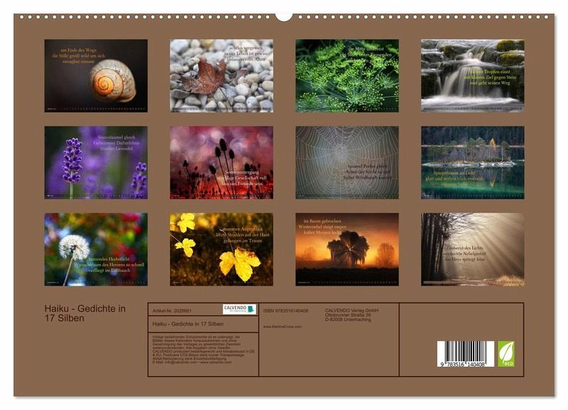 PREMIUM-LINIE - Brillanter Fotokalender mit 12 wunderschönen Motiven, Kunstdruck in Hochglanz in Museumsqualität.QUALITÄT - edle Materialien, stabile Rückwand mit 2 innovativen Einstecktaschen für eine optimale Präsentation an der Wand.NACHHALTIG - deutliche Abfallreduzierung durch bedarfsgerechte Einzelstückfertigung, umweltfreundliches FSC-zertifiziertes Papier, Produktion in Deutschland, klimabewusste Logistik.PERFEKTES GESCHENK - Kalender für Freunde und Familie, für Kinder und Erwachsene, jung und alt, zu Weihnachten, Geburtstag oder zwischendurch.Haiku, poetische Gedichte in 17 Silben von Autor(in): Martina Cross
