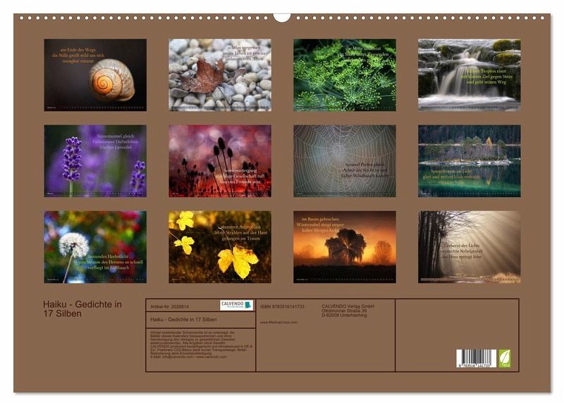 QUALITÄT - Hochwertiger Fotokalender mit 12 wunderschönen Motiven auf lichtbeständigem Bilderdruckpapier, robuste Spiralbindung mit Aufhängebügel.NACHHALTIG - deutliche Abfallreduzierung durch bedarfsgerechte Einzelstückfertigung, umweltfreundliches FSC-zertifiziertes Papier, Produktion in Deutschland, klimabewusste Logistik.PERFEKTES GESCHENK - Kalender für Freunde und Familie, für Kinder und Erwachsene, jung und alt, zu Weihnachten, Geburtstag oder zwischendurch.VIELFALT - Bildkalender in verschiedenen Formaten, z.B. DIN A5, DIN A4, DIN A3 sowie DIN A2. Ob Naturmotiv, Gemälde oder Fotos, ideal für ein persönliches Wohlfühlambiente.Haiku, poetische Gedichte in 17 Silben von Autor(in): Martina Cross