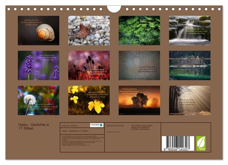 QUALITÄT - Hochwertiger Fotokalender mit 12 wunderschönen Motiven auf lichtbeständigem Bilderdruckpapier, robuste Spiralbindung mit Aufhängebügel.NACHHALTIG - deutliche Abfallreduzierung durch bedarfsgerechte Einzelstückfertigung, umweltfreundliches FSC-zertifiziertes Papier, Produktion in Deutschland, klimabewusste Logistik.PERFEKTES GESCHENK - Kalender für Freunde und Familie, für Kinder und Erwachsene, jung und alt, zu Weihnachten, Geburtstag oder zwischendurch.VIELFALT - Bildkalender in verschiedenen Formaten, z.B. DIN A5, DIN A4, DIN A3 sowie DIN A2. Ob Naturmotiv, Gemälde oder Fotos, ideal für ein persönliches Wohlfühlambiente.Haiku, poetische Gedichte in 17 Silben von Autor(in): Martina Cross