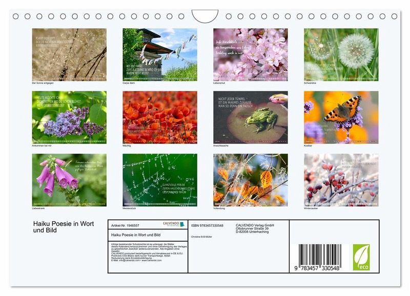 QUALITÄT - Hochwertiger Fotokalender mit 12 wunderschönen Motiven auf lichtbeständigem Bilderdruckpapier, robuste Spiralbindung mit Aufhängebügel.NACHHALTIG - deutliche Abfallreduzierung durch bedarfsgerechte Einzelstückfertigung, umweltfreundliches FSC-zertifiziertes Papier, Produktion in Deutschland, klimabewusste Logistik.PERFEKTES GESCHENK - Kalender für Freunde und Familie, für Kinder und Erwachsene, jung und alt, zu Weihnachten, Geburtstag oder zwischendurch.VIELFALT - Bildkalender in verschiedenen Formaten, z.B. DIN A5, DIN A4, DIN A3 sowie DIN A2. Ob Naturmotiv, Gemälde oder Fotos, ideal für ein persönliches Wohlfühlambiente.Sinnige und hintersinnige Momentaufnahmen von Autor(in): Christine Brendle-Behnisch Müller