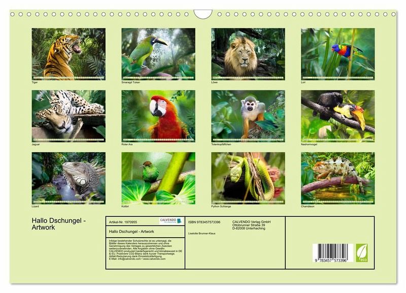 QUALITÄT - Hochwertiger Fotokalender mit 12 wunderschönen Motiven auf lichtbeständigem Bilderdruckpapier, robuste Spiralbindung mit Aufhängebügel.NACHHALTIG - deutliche Abfallreduzierung durch bedarfsgerechte Einzelstückfertigung, umweltfreundliches FSC-zertifiziertes Papier, Produktion in Deutschland, klimabewusste Logistik.PERFEKTES GESCHENK - Kalender für Freunde und Familie, für Kinder und Erwachsene, jung und alt, zu Weihnachten, Geburtstag oder zwischendurch.VIELFALT - Bildkalender in verschiedenen Formaten, z.B. DIN A5, DIN A4, DIN A3 sowie DIN A2. Ob Naturmotiv, Gemälde oder Fotos, ideal für ein persönliches Wohlfühlambiente.Dschungeltiere Artwork von Autor(in): Liselotte Brunner-Klaus