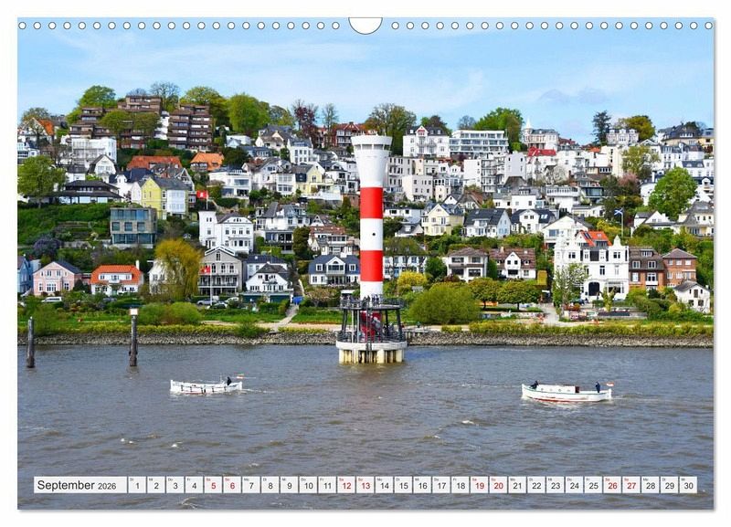 September: Blick von der Elbe auf den beliebten Ausflugsort Blankenese mit dem Leuchtturm Unterfeuer