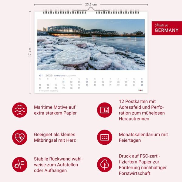 Die Perle des Nordens in stimmungsvollen Bildern: Hamburg im Panorama-Postkartenkalender 2026 Vom winterlichen Hafenpanorama bis zur charakteristischen Elbphilharmonie: Postkarten-Fotokalender mit 13 traumhaft schönen Aufnahmen aus der Alstermetropole Das "Tor zur Welt" von seiner besten Seite: Kleiner Kalender mit Panoramakarten zum Verschicken oder selbst Aufhängen Immer eine gute Idee als originelles Mitbringsel oder individuelles Geschenk: Hamburg im Kleinformat, 23,5x17 cm Ein maritimer Jahresbegleiter: Nur einer von vielen Hamburg-Kalendern aus dem Hause Eiland im Athesia Kalenderverlag