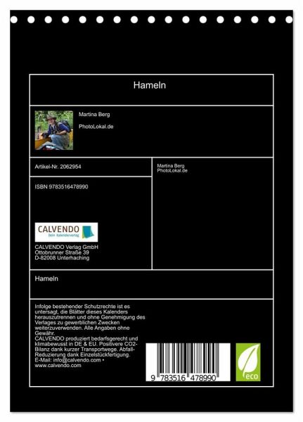 QUALITÄT - Hochwertiger Fotokalender mit 12 wunderschönen Motiven auf lichtbeständigem Bilderdruckpapier, robuste Spiralbindung.NACHHALTIG - deutliche Abfallreduzierung durch bedarfsgerechte Einzelstückfertigung, umweltfreundliches FSC-zertifiziertes Papier, Produktion in Deutschland, klimabewusste Logistik.PERFEKTES GESCHENK - Kalender für Freunde und Familie, für Kinder und Erwachsene, jung und alt, zu Weihnachten, Geburtstag oder zwischendurch.VIELFALT - Bildkalender in verschiedenen Formaten, z.B. DIN A5, DIN A4, DIN A3 sowie DIN A2. Ob Naturmotiv, Gemälde oder Fotos, ideal für ein persönliches Wohlfühlambiente.Kleiner Spaziergang durch die Rattenfängerstadt von Autor(in): Martina Berg