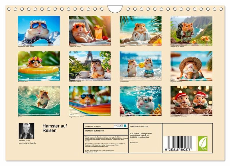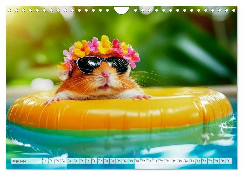 Erlebe niedliche Hamster, die entspannt am Strand liegen, in den Bergen wandern, Cocktails trinken oder in einer Hängematte dösen. Die Szenen wurden liebevoll und fantasievoll mit künstlicher Intelligenz erschaffen. Jeden Monat ein neues, witziges und charmantes Motiv, das garantiert ein Lächeln auf dein Gesicht zaubert. Ob als Geschenk für Tierliebhaber, KI-Fans oder einfach für dich selbst; dieser Kalender ist ein fröhlicher Begleiter durch das ganze Jahr.