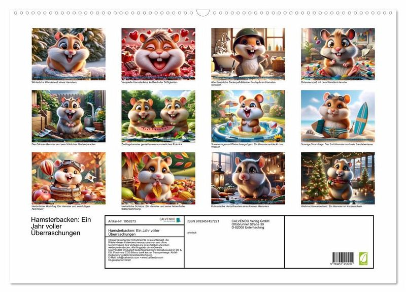 Entdecken Sie 'Hamsterbacken: Ein Jahr voller Überraschungen'! Jeder Monat überrascht mit einem einzigartigen, KI-erschaffenen Hamster-Motiv, das Ihr Herz erobert. Von sommerlichen Abenteuern bis hin zu winterlichen Wundern - dieser Kalender bringt Freude in jeden Tag. Ein perfektes Geschenk für Hamsterfreunde!