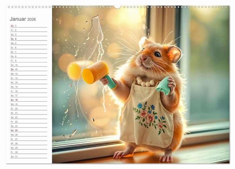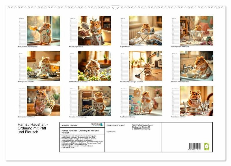 Entdecke den charmanten Alltag unseres flauschigen Haushalts-Hamster. Lass dich von unserem kleinen pelzigen Freund verzaubern, der mit viel Humor und einer Prise Kreativität den Haushalt aufmischt! In jedem Monat erwartet dich ein neues, KI-generiertes Bild, das zeigt, wie unser flauschiger Hamster die unterschiedlichsten Aufgaben meistert - vom Bügeln über Kochen bis hin zum Staubsaugen. Ein Kalender, der nicht nur praktisch ist, sondern auch dein Herz erwärmt! Perfekt als Geschenk für Tierliebhaber und alle, die den Alltag mit einem Lächeln begegnen möchten. Mach jeden Monat zu einem fröhlichen Erlebnis