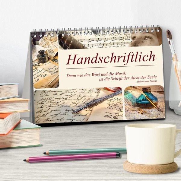 Der Kalender "Handschriftlich" zeigt handgeschriebene Schriftstücke der deutschen Sprache - von Amtsschreiben über private Korrespondenz bis hin zu Tagebuchaufzeichnungen und Notenblättern. Von der Kurrentschrift über die Sütterlin Schrift bis hin zur lateinischen Ausgangsschrift zeigen die Motive, wie individuell und ausdrucksstark die Schrift eines Menschen sein kann. Ergänzt durch das Handwerkszeug des Schreibens entsteht mit diesen Bildern eine visuelle Reise durch die bedeutende Rolle der Schrift als Ausdruck der Persönlichkeit und Seele. Der Kalender zeigt uns auch, was und wie viel wir verloren haben durch das Verschwinden der Handschrift in unserer Kommunikation.