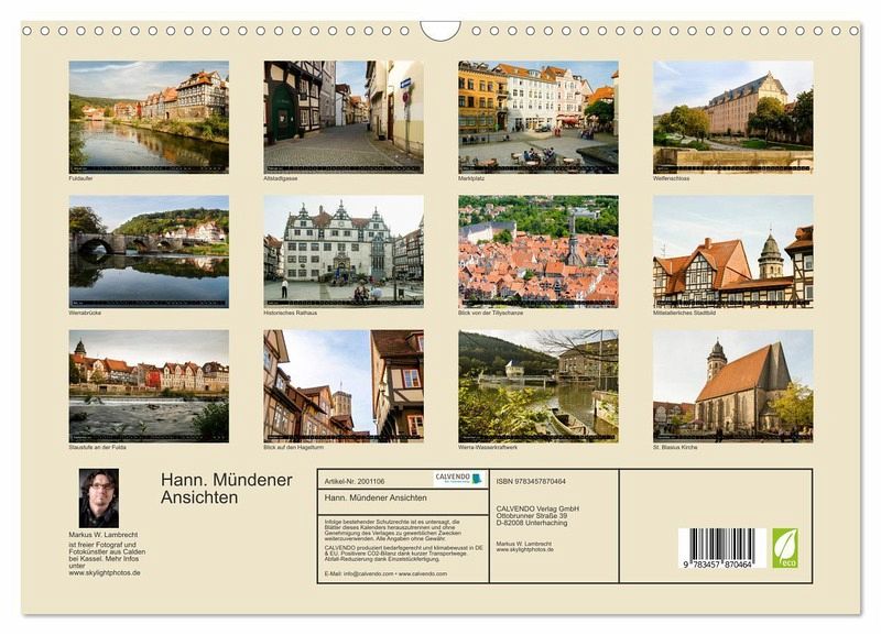 QUALITÄT - Hochwertiger Fotokalender mit 12 wunderschönen Motiven auf lichtbeständigem Bilderdruckpapier, robuste Spiralbindung mit Aufhängebügel.NACHHALTIG - deutliche Abfallreduzierung durch bedarfsgerechte Einzelstückfertigung, umweltfreundliches FSC-zertifiziertes Papier, Produktion in Deutschland, klimabewusste Logistik.PERFEKTES GESCHENK - Kalender für Freunde und Familie, für Kinder und Erwachsene, jung und alt, zu Weihnachten, Geburtstag oder zwischendurch.VIELFALT - Bildkalender in verschiedenen Formaten, z.B. DIN A5, DIN A4, DIN A3 sowie DIN A2. Ob Naturmotiv, Gemälde oder Fotos, ideal für ein persönliches Wohlfühlambiente.Eine Bilderreise durch die Fachwerkstadt Hannoversch Münden von Autor(in): Markus W. Lambrecht