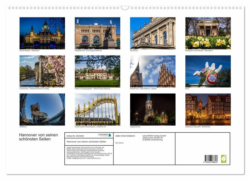QUALITÄT - Hochwertiger Fotokalender mit 12 wunderschönen Motiven auf lichtbeständigem Bilderdruckpapier, robuste Spiralbindung mit Aufhängebügel.NACHHALTIG - deutliche Abfallreduzierung durch bedarfsgerechte Einzelstückfertigung, umweltfreundliches FSC-zertifiziertes Papier, Produktion in Deutschland, klimabewusste Logistik.PERFEKTES GESCHENK - Kalender für Freunde und Familie, für Kinder und Erwachsene, jung und alt, zu Weihnachten, Geburtstag oder zwischendurch.VIELFALT - Bildkalender in verschiedenen Formaten, z.B. DIN A5, DIN A4, DIN A3 sowie DIN A2. Ob Naturmotiv, Gemälde oder Fotos, ideal für ein persönliches Wohlfühlambiente.Impressionen von Hannovers Sehenswürdigkeiten von Autor(in): Dirk Sulima