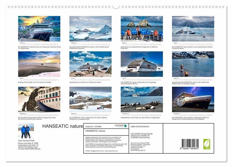 Das Kreuzfahrtschiff HANSEATIC nature ist eines der neuen Expeditionsschiffe der Hamburger Reederei Hapag-Lloyd Cruises, die weltweit den höchsten Standard bei Reisen in die Arktis und Antarktis erfüllt. Unter dem Motto" Mehr als Eis" entstanden während der Jungfernfahrt die Kalenderbilder am fünften Kontinent. Hier hört man förmlich das Eis der Antarktis knacken.