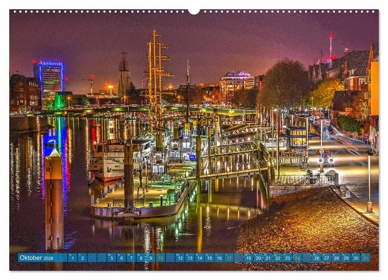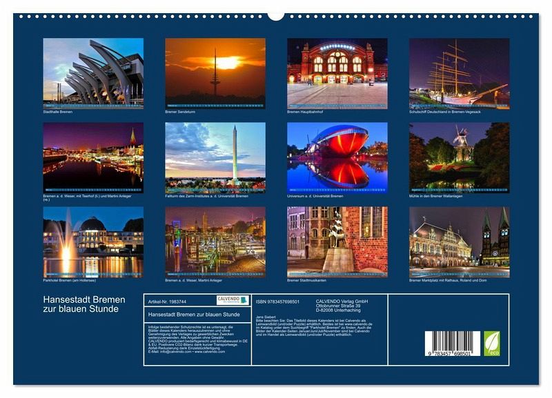 Der Semiprofi-Fotograf Jens Siebert präsentiert in diesem Kalender eine Serie von Aufnahmen aus seiner Heimatstadt, der Hansestadt Bremen. Alle Bilder wurden in der Nacht oder zur blauen Stunde mit dem Stativ und als Langzeitbelichtung aufgenommen.