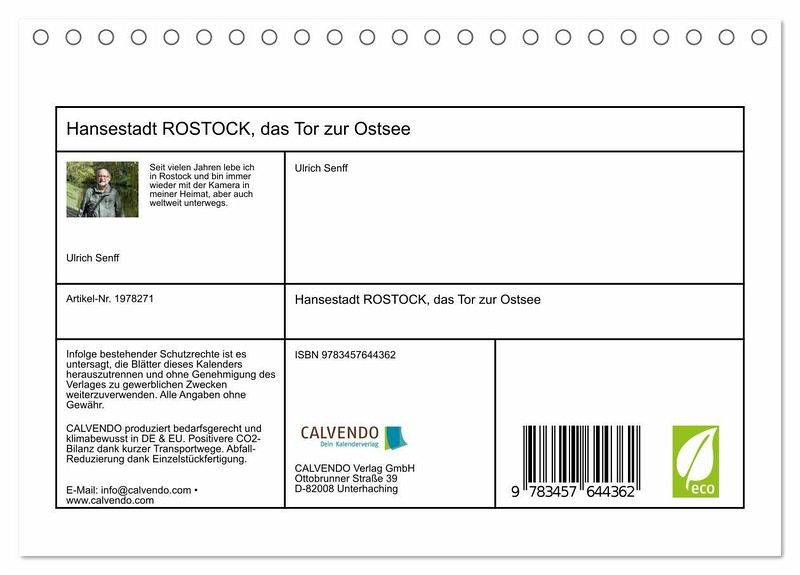 Das rund 200 000 Einwohner zählende Rostock hat als Hansestadt und größte Hafenstadt im Osten Deutschlands eine lange Tradition. Großartige alte Baudenkmäler gepaart mit modernen Elementen bilden hier ein wunderschönes Ensemble. Der in Rostock lebende Autor präsentiert im Kalender einige seiner beeindruckenden Bilder.