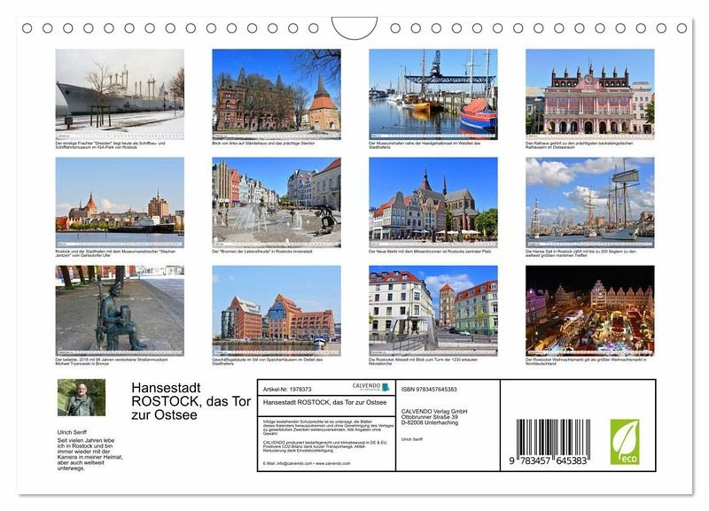 Das rund 200 000 Einwohner zählende Rostock hat als Hansestadt und größte Hafenstadt im Osten Deutschlands eine lange Tradition. Großartige alte Baudenkmäler gepaart mit modernen Elementen bilden hier ein wunderschönes Ensemble. Der in Rostock lebende Autor präsentiert im Kalender einige seiner beeindruckenden Bilder.