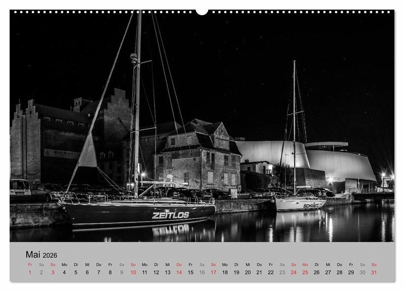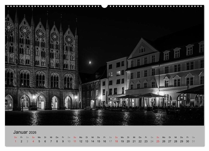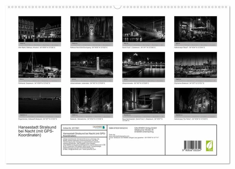 Mit dem Kalender "Hansestadt Stralsund bei Nacht", fügt der Fotograf Colin Utz einen weiteren Kalender zu seiner Serie mit Städteportraits bei Nacht hinzu. Die stimmungsvollen Schwarz-Weiß-Fotografien der fast menschenleeren historische Altstadt der Hanse- und UNESCO Weltkulturerbestadt Stralsund mit dem Alten Markt, dem Rathaus, der Nikolaikirche, dem Hafen an der Ostsee mit dem Segelschulschiff Gorch Fock 1, den vielen Segelyachten, dem Ozeaneum, und urigen Hafenkneipen, heben sich erfreulich von den sonst üblichen Postkarten-Ansichten ab. Die GPS-Koordinaten der Aufnahmestandorte werden mit den Bildtiteln aufgeführt.