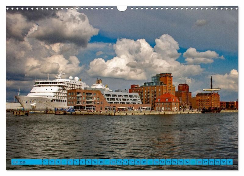 Juli: Maritimer Moment mit einem Kreuzfahrer und der Silhouette des Wismarer Alten Hafens mit der Speicherstadt