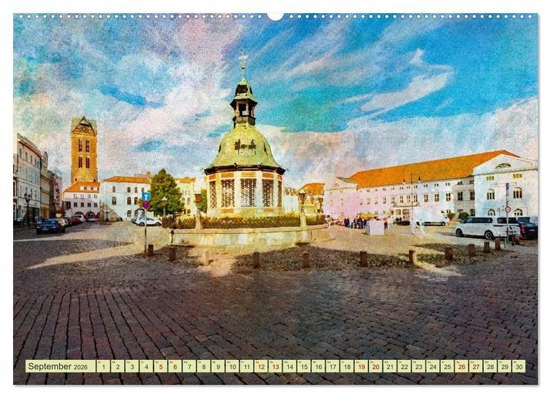 September: Blick auf die Wismarer Wasserkunst und den Marktplatz mit Rathaus
