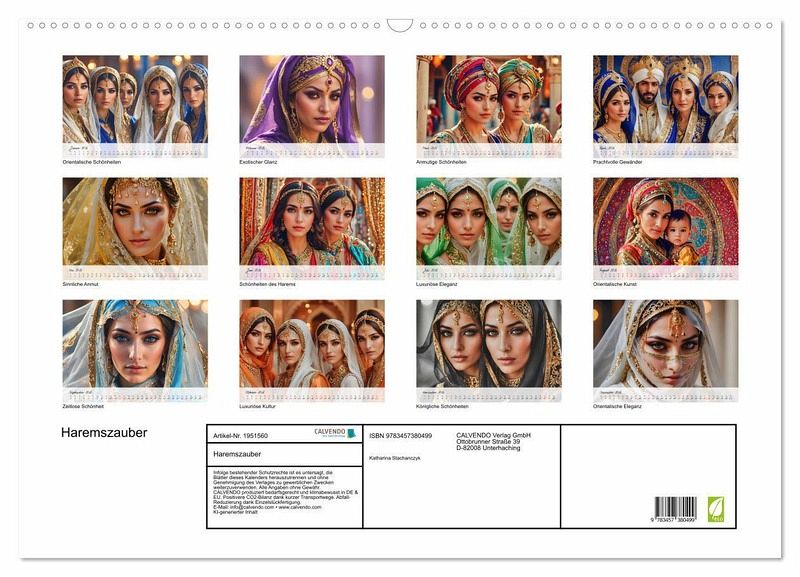 Entdecken Sie die faszinierende Welt des Osmanischen Reiches mit dem atemberaubenden Kalender "Haremszauber - Schönheit und Eleganz im Sultanspalast." Jede Seite enthüllt die zeitlose Anmut und prachtvolle Eleganz der Haremsdamen des Sultans, eingefangen in exquisiten KI-Bildern, die die reiche Kultur und das luxuriöse Leben im Palast widerspiegeln. Lassen Sie sich jeden Monat von der orientalischen Schönheit und den opulenten Gewändern verzaubern und tauchen Sie ein in eine Welt voller Geheimnisse und königlicher Pracht. Dieser Kalender ist ein wahres Kunstwerk, das Ihre Wände schmücken und Ihre Sinne betören wird.