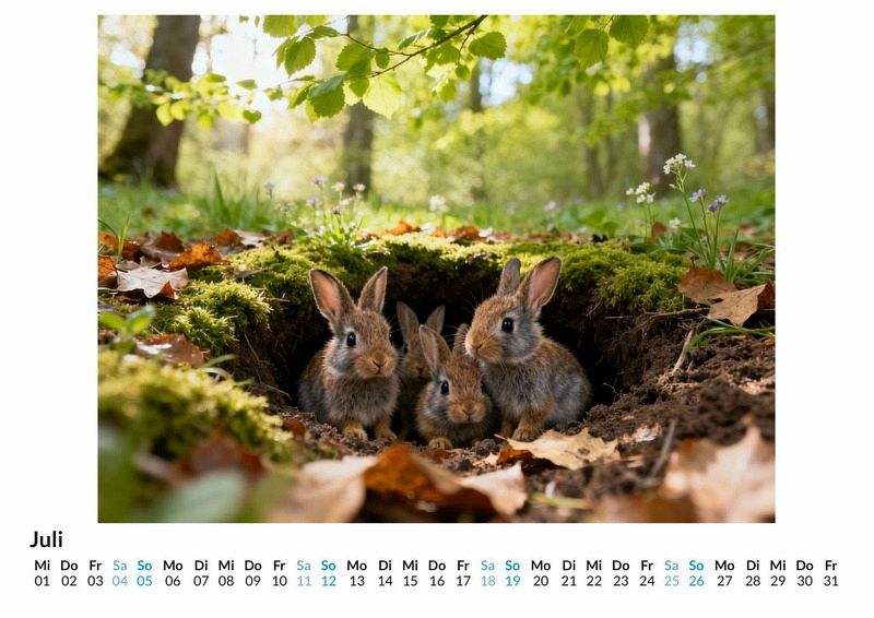 Mit ihrem sanften Wesen und dem flauschigen Fell verkörpern Hasen und Kaninchen eine natürliche Anmut. Der Kalender "Hase & Kaninchen" widmet sich diesen beliebten Tieren und begleitet mit zwölf sorgfältig ausgewählten Motiven durch das Jahr. Jedes Bild fängt den besonderen Charakter der Langohren ein und schafft eine ruhige, angenehme Atmosphäre. Dieser Kalender ist eine gute Wahl: * Für alle, die sich an dem Anblick von Hasen und Kaninchen erfreuen. * Für Menschen, die eine klassische und zeitlose Wanddekoration suchen. * Als Geschenkidee, die nicht nur zur Osterzeit Freude bereitet. Die zwölf Monatsblätter präsentieren die Tiere in detailreichen Szenen. Jedes einzelne Motiv ist das Ergebnis eines kreativen Prozesses, bei dem digitale Werkzeuge und Algorithmen die Vision zum Leben erweckt haben. Diese Kompositionen fangen die charakteristische Sanftheit der Tiere ein und schaffen eine harmonische Stimmung für jeden Monat des Jahres. Was dieser Kalender bietet: * Zwölf Monatsmotive mit Hasen und Kaninchen. * Ein übersichtliches Kalendarium für Termine und Notizen. * Ein Begleiter für das ganze Jahr, passend für jede Jahreszeit. Der Kalender "Hase & Kaninchen" ist eine Hommage an die unaufdringliche Schönheit dieser Tiere. Er bringt Ruhe und einen Hauch von Natur in den Alltag. Entdecken Sie die einzelnen Monatsblätter und finden Sie Ihr Lieblingsmotiv.