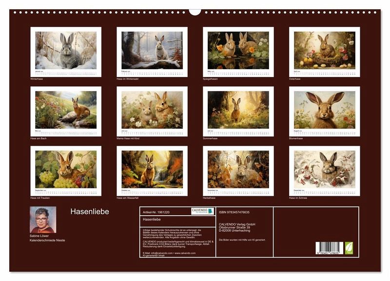 Weiches Fell, ziemlich lange Ohren, Stummelschwänzchen und auffällige Vorderzähne: Ja, wir kennen sie alle, die niedlichen Hasen und Kaninchen! Sie gehören zu den beliebtesten Haustieren und folgen Katzen und Hunden auf Platz drei. Die Autorin hat mit Hilfe von KI bezaubernde Bilder unserer flauschigen Lieblinge geschaffen. Freuen Sie sich Monat für Monat auf saisonale Bilder für die eigene Wand oder als Geschenk.