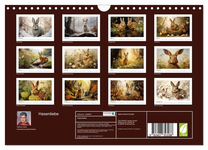 Weiches Fell, ziemlich lange Ohren, Stummelschwänzchen und auffällige Vorderzähne: Ja, wir kennen sie alle, die niedlichen Hasen und Kaninchen! Sie gehören zu den beliebtesten Haustieren und folgen Katzen und Hunden auf Platz drei. Die Autorin hat mit Hilfe von KI bezaubernde Bilder unserer flauschigen Lieblinge geschaffen. Freuen Sie sich Monat für Monat auf saisonale Bilder für die eigene Wand oder als Geschenk.