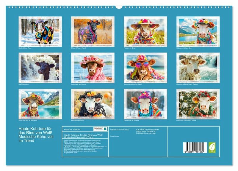Erleben Sie das Beste aus Mode und Landwirtschaft mit diesem tollen "Kuh-ture" Kalender! Die charmanten Kühe zeigen, dass Stil keine Grenzen kennt, während sie sich an verschiedenen atemberaubenden Orten für ihre Fotoshootings präsentieren. Vom sonnigen Strand bis hin zur malerischen Berglandschaft, diese muh-dernen Models wissen genau, wie man die Kamera zum Lächeln bringt - und dabei immer top gestylt ist! Alle Illustrationen wurden mit Hilfe von KI erstellt und bringen tierischen Spaß in jedes Zuhause.