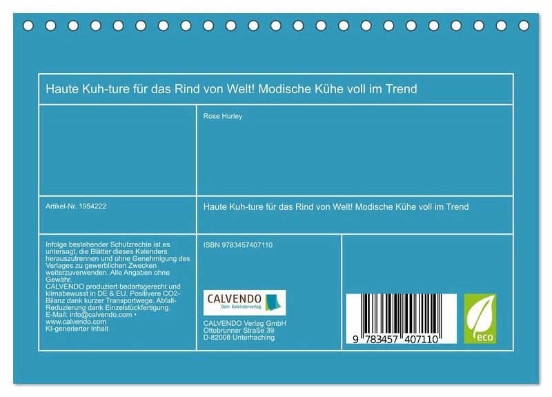 Erleben Sie das Beste aus Mode und Landwirtschaft mit diesem tollen "Kuh-ture" Kalender! Die charmanten Kühe zeigen, dass Stil keine Grenzen kennt, während sie sich an verschiedenen atemberaubenden Orten für ihre Fotoshootings präsentieren. Vom sonnigen Strand bis hin zur malerischen Berglandschaft, diese muh-dernen Models wissen genau, wie man die Kamera zum Lächeln bringt - und dabei immer top gestylt ist! Alle Illustrationen wurden mit Hilfe von KI erstellt und bringen tierischen Spaß in jedes Zuhause.