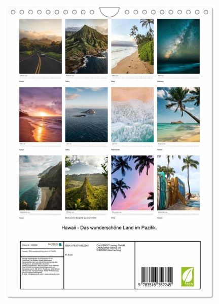 QUALITÄT - Hochwertiger Fotokalender mit 12 wunderschönen Motiven auf lichtbeständigem Bilderdruckpapier, robuste Spiralbindung mit Aufhängebügel.NACHHALTIG - deutliche Abfallreduzierung durch bedarfsgerechte Einzelstückfertigung, umweltfreundliches FSC-zertifiziertes Papier, Produktion in Deutschland, klimabewusste Logistik.PERFEKTES GESCHENK - Kalender für Freunde und Familie, für Kinder und Erwachsene, jung und alt, zu Weihnachten, Geburtstag oder zwischendurch.VIELFALT - Bildkalender in verschiedenen Formaten, z.B. DIN A5, DIN A4, DIN A3 sowie DIN A2. Ob Naturmotiv, Gemälde oder Fotos, ideal für ein persönliches Wohlfühlambiente.Zwölf erstklassige Bilder vom farbenfrohen Hawaii. von Autor(in): Benjamin Lederer