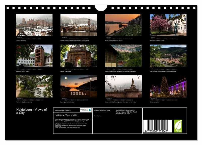 Heidelberg is one of the most beautiful and famous cities in Germany. Thousands of tourists from around the world annually visit the historic old town of Heidelberg and the castle. This calendar takes you to known and less known places of the city and the surrounding area.