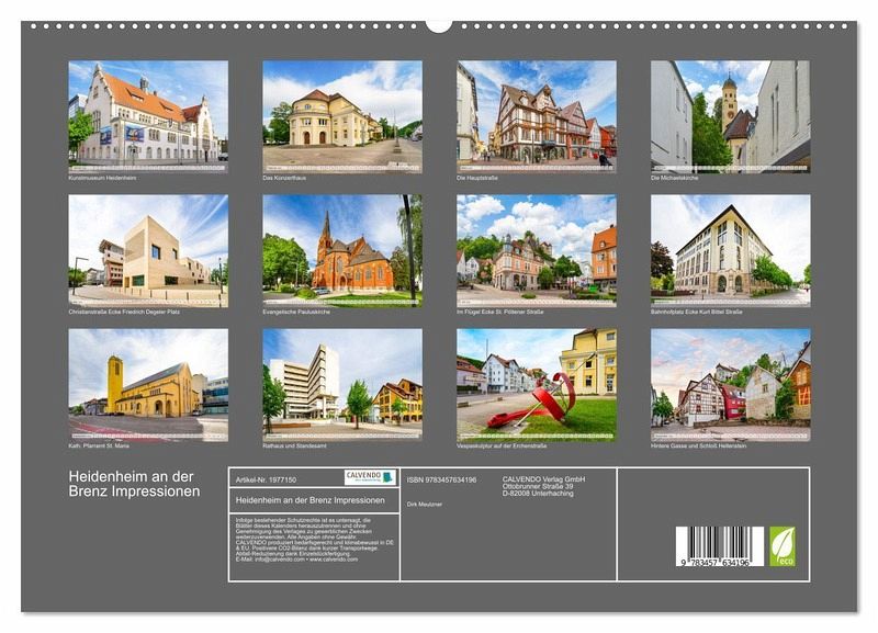Heidenheim an der Brenz ist eine Stadt im Osten Baden-Württembergs an der Grenze zu Bayern und größte Stadt des Landkreises Heidenheim und nach Aalen und Schwäbisch Gmünd die drittgrößte Stadt der Region Ostwürttemberg. Gehen sie mit dem Fotografen Dirk Meutzner durch die Straßen genießen Sie Monat für Monat eine neue Ansicht von Heidenheim an der Brenz. Dieser wunderschöne Kalender eignet sich auch hervorragend als Geschenk für Ihre Verwandten und Bekannten.