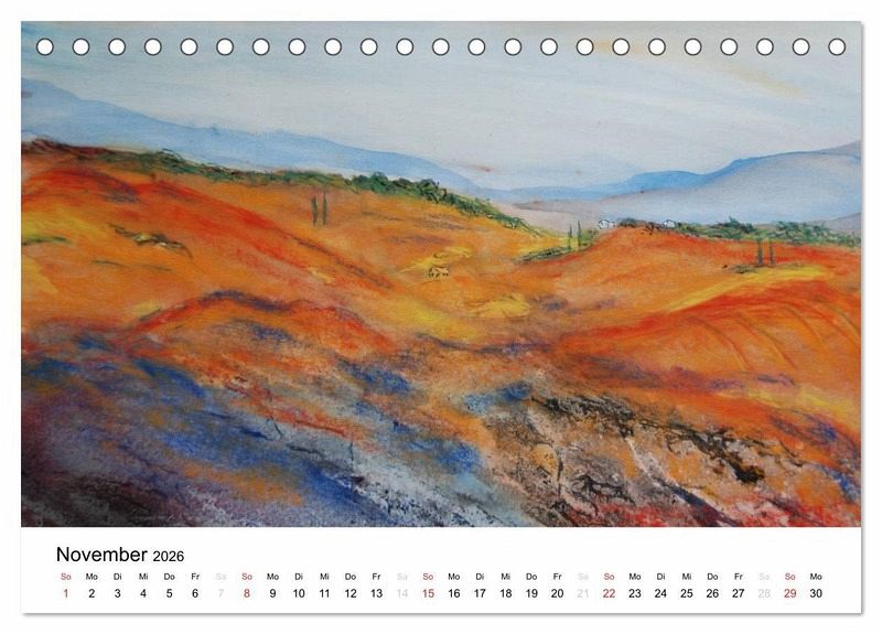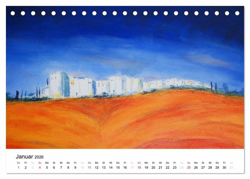 Bildkalender, Toskanakalender mit 12 Aquarellen bzw. Acrylmalereien, die die charakteristischen Merkmale der italienischen Landschaften widerspiegeln. Sämtliche Bilder zeigen die Vielfalt Italiens und doch vereinen sie die Liebe zu einem Land, ihren Zypressen, sanften Hügeln, steilen Küsten und bunten Häusern. Italien, insbesondere die Toskana, steht für Natur, Kunst und Kultur - mit diesem Aquarellkalender werden alle Eigenschaften vereint. Dieser Italienkalender gewährt Einblicke und transportiert die Sonne und Wärme des Landes "nach Hause" und zeigt sich in Gelb, Rot und kräftigem Orange. Ein Acrylkalender, der die Liebe zu Italien weckt - jeden Monat aufs Neue!