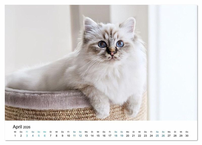 Unser hochwertiger Kalender enthält zwölf bezaubernde Fotos von hübschen und kuscheligen Heilige Birma Katzen, die jedes Liebhaberherz höher schlagen lassen.