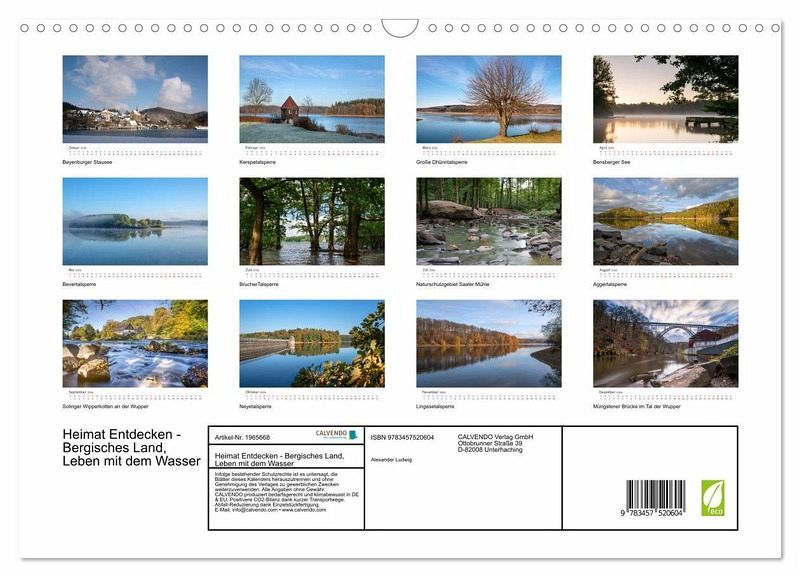 QUALITÄT - Hochwertiger Fotokalender mit 12 wunderschönen Motiven auf lichtbeständigem Bilderdruckpapier, robuste Spiralbindung mit Aufhängebügel.NACHHALTIG - deutliche Abfallreduzierung durch bedarfsgerechte Einzelstückfertigung, umweltfreundliches FSC-zertifiziertes Papier, Produktion in Deutschland, klimabewusste Logistik.PERFEKTES GESCHENK - Kalender für Freunde und Familie, für Kinder und Erwachsene, jung und alt, zu Weihnachten, Geburtstag oder zwischendurch.VIELFALT - Bildkalender in verschiedenen Formaten, z.B. DIN A5, DIN A4, DIN A3 sowie DIN A2. Ob Naturmotiv, Gemälde oder Fotos, ideal für ein persönliches Wohlfühlambiente.Der Wasserreichtum bestimmt das Leben im Bergischen Land und schafft einzigartige Naturräume. von Autor(in): alfotokunst
