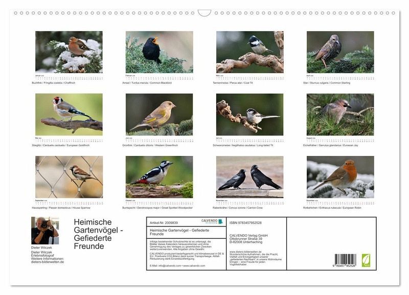 Gefiederte Freunde ist eine neue Ausgabe des beliebten Kalenders "Heimische Gartenvögel" von Dieter Wilczek. Dem "Natur- und Erlebnisfotografen" ist es auch mit dieser abwechslungsreichen Bildauswahl gelungen, unsere wohl "schönsten" Nachbarn eindrucksvoll im Bild festzuhalten: Seit vielen Jahren beobachtet und fotografiert er in jeder Jahreszeit die verschiedenen Vögel, die in seinem Garten ihre Lieder zwitschern. Das Ergebnis sind eindrucksvolle Tieraufnahmen, die dem Betrachter die überraschende Vielfalt, aber auch die Einzigartigkeit ihrer Gefieder, Schnäbel und Farben näher bringen. Ein weiterer Beleg dafür, dass die Schönheit der Natur auch direkt bei uns vor der Haustür zu bewundern ist...