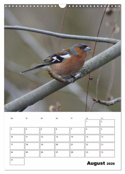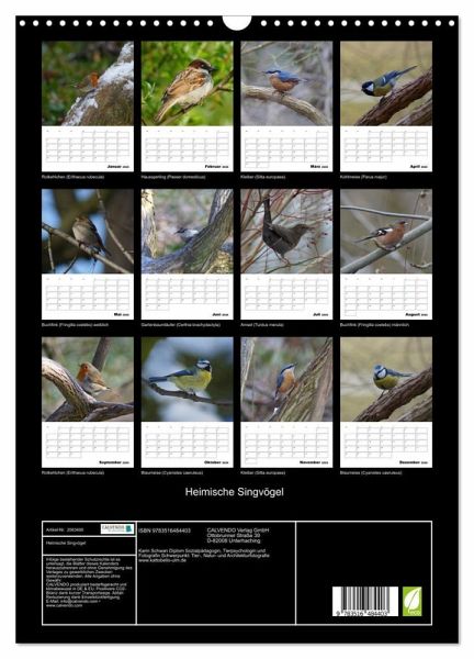 Es gibt weltweit circa 4000 Singvogelarten. Dieser Kalender widmet sich den Singvögeln, die bei uns beheimatet sind. Dies sind bekannte Arten wie das Rotkehlchen, Meisen, Finken, Spechte und Sperlinge. Aber auch seltenere Arten wie der Kleiber oder der Gartenbaumläufer. Diese bunte Vogelschar soll sie das ganze Jahr über erfreuen.
