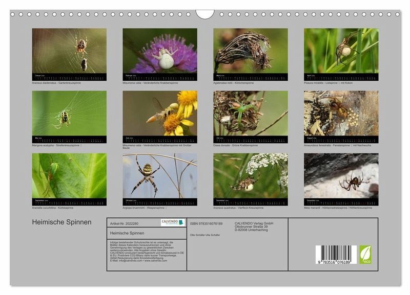 Der Kalender zeigt die schöne und interessante Seite und die Farbenvielfalt unserer heimischen Spinnen. Er bringt ein wenig Licht in die Welt der Spinnen mit schönen Fotos.